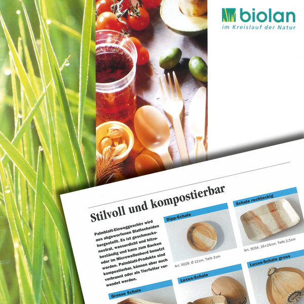 1997: Im Auftrag des Agro-Center Malters erfanden wir zusammen mit Rolf Beyeler den Name «biolan» als Marke für eine Art Kunststoff aus diversen nachwachsenden Rohstoffen für kompostierbares Einweggeschirr. Mit demselben grafischen Auftritt wurde auch das beliebte Palmblattgeschirr vermarktet. Später ersetzte die Pacovis AG den Name «biolan» durch «compost-it» und danach «naturesse».