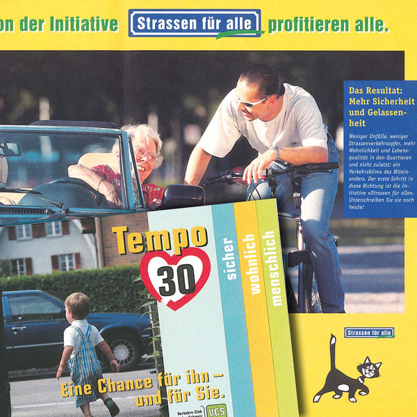 2001: Zwar verlor der Verkehrs-Club der Schweiz VCS am 4. März die Abstimmung zur Tempo-30-Initiative, trotzdem ist heute vielerorts im Siedlungsgebiet flächendeckend Tempo 30 signalisiert. Wir gestalteten die Drucksachen zur Unterschriftensammlung – man nannte die Initiative damals noch «Strassen für alle». Unser «Tempo-30-Herz» erfanden wir ursprünglich für eine erfolgreiche Oltner Abstimmung und 2013 wurde es sogar für die erste Europäische Bürgerinitiative adaptiert.