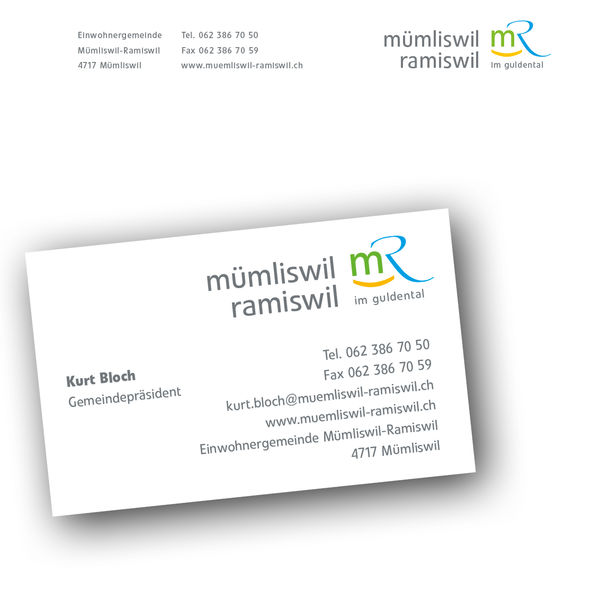 2011: Der Auftrag lautete, der Einwohnergemeinde Mümliswil-Ramiswil einen frischen und attraktiven Auftritt zu geben. Ich setzte diesen Wunsch um mit einem waldgrünen «m» der Schrift Evo des Schweizer Schriftgestalters Marco Ganz, einem wasserblauen bachartig geschwungenen «R»-Teil, gefasst vom «guldenen» Tal. In guter Zusammenarbeit mit dem Gemeindeschreiber Josef Tschan wurden alle Drucksachen und digitalen Kommunikationsmittel gemäss dem luftigen neuen Erscheinungsbild aufgefrischt. Ihren neuen Auftritt verwendet die Gemeinde auch für ihre Website und vielleicht auch für die geplante Dorfzeitung.