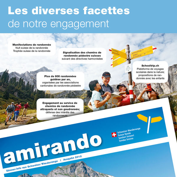 2012: «amirando» – Das neue Heft des Verbands Schweizer Wanderwege zeigt ihren Gönnerinnen und Gönnern, wo und wie sich seine Aktiven – Profis wie auch Freiwillige – überall engagieren. Dies stiess auf grosses Interesse und brachte den sympathischen Mailings finanziellen Erfolg. Mein bescheidener Beitrag war der Name des Hefts und sein Layout.