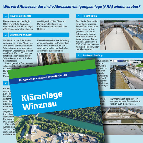 2019: Von 2013 bis 2019 wurde die Kläranlage Winznau umfangreich renoviert und mit einer biologischen Reinigungsstufe ergänzt: den vier Sequencing Batch Reactors. Bei schönstem Wetter konnte im August die Kläranlage der Bevölkerung präsentiert werden. Mein Beitrag dazu war die Produktion eines Flyers, der mit Text und Fotos der zahlreichen Anlageteilen und Arbeitsschritten den komplexen Abwasserreinigungsvorgang möglichst verständlich darstellt. Zudem zeige ich darin auch, wie der dabei anfallende Schlamm behandelt und verwertet wird. Nur schade ist, dass wir die vielfältige Geruchswelt im Flyer nicht festhalten konnten.
